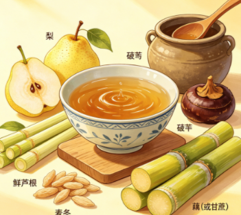 组成: 首先,我们需要准备甘蔗汁、生梨汁、芦根汁、鲜藕汁各50毫升,竹沥20毫升,鲜牛奶80毫升作为主要食材。 制法: 按常规方法备好甘蔗汁、生梨汁、芦根...